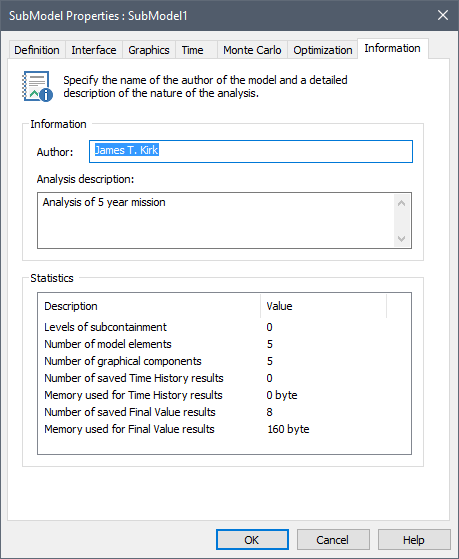 The Information tab of the SubModel A specialized element that allows you embed one complete GoldSim model within another GoldSim model. This facilitates, among other things, probabilistic optimization, explicit separation of uncertainty from variability, and manipulation of Monte Carlo statistics. dialog displays some summary information regarding the SubModel: